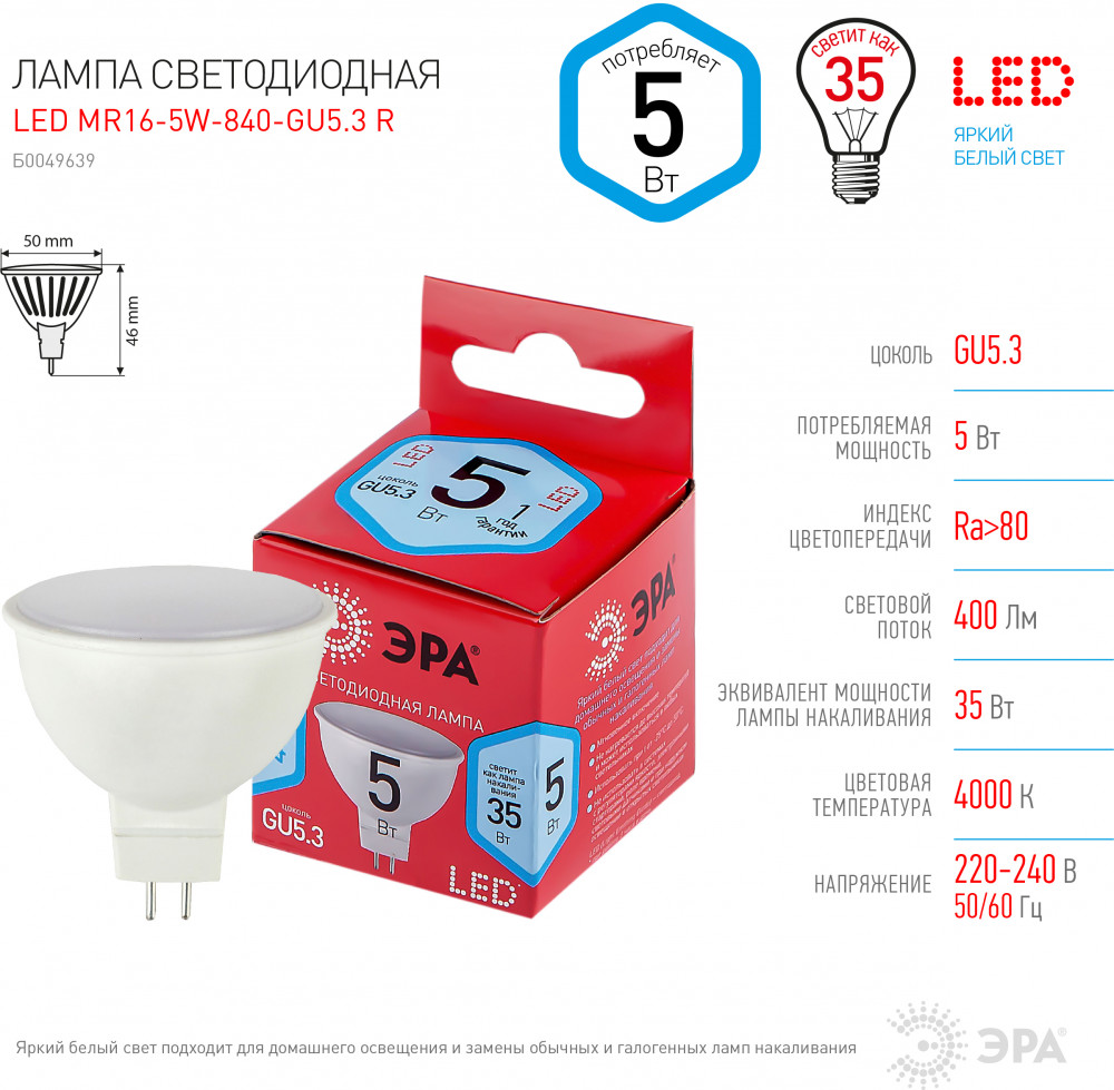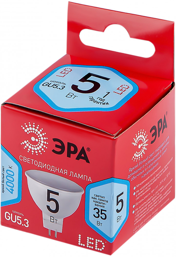 Эра Лампа светодиодная Эра MR16-5W-840-GU5.3 R+14 мягкий свет долговечность подходящая мощность хорошая яркость