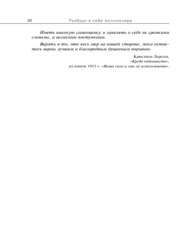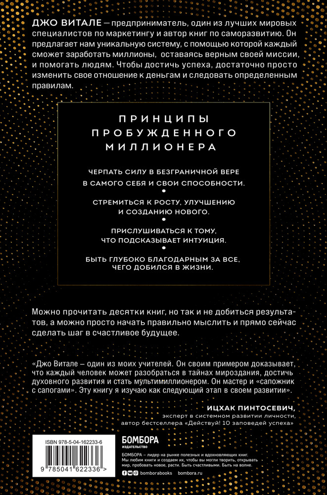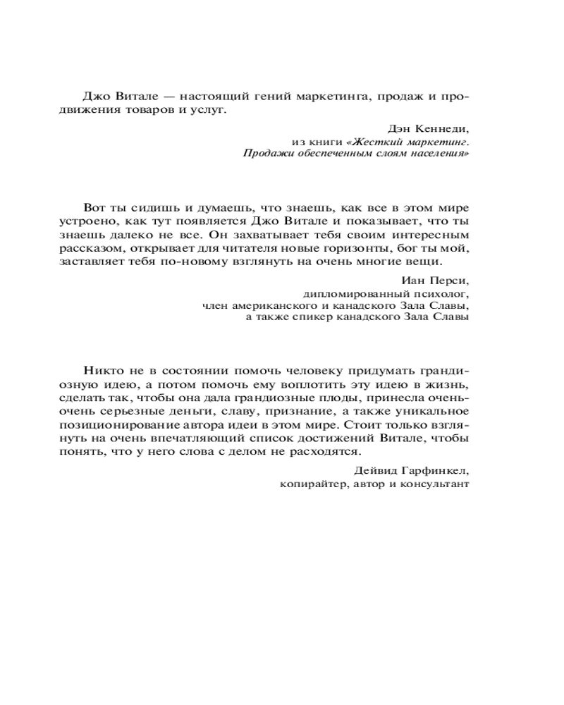 «Джо Витале — один из моих учителей. Он своим примером доказывает, что каждый человек может разобраться в тайнах мироздания, достичь духовного развития и стать мультимиллионером. Он мастер и «сапожник с сапогами». Эту книгу я изучаю, как следующий этап в своем развитии», — Ицхак Пинтосевич, эксперт в системном развитии личности, автор бестселлера «Действуй! 10 заповедей успеха».