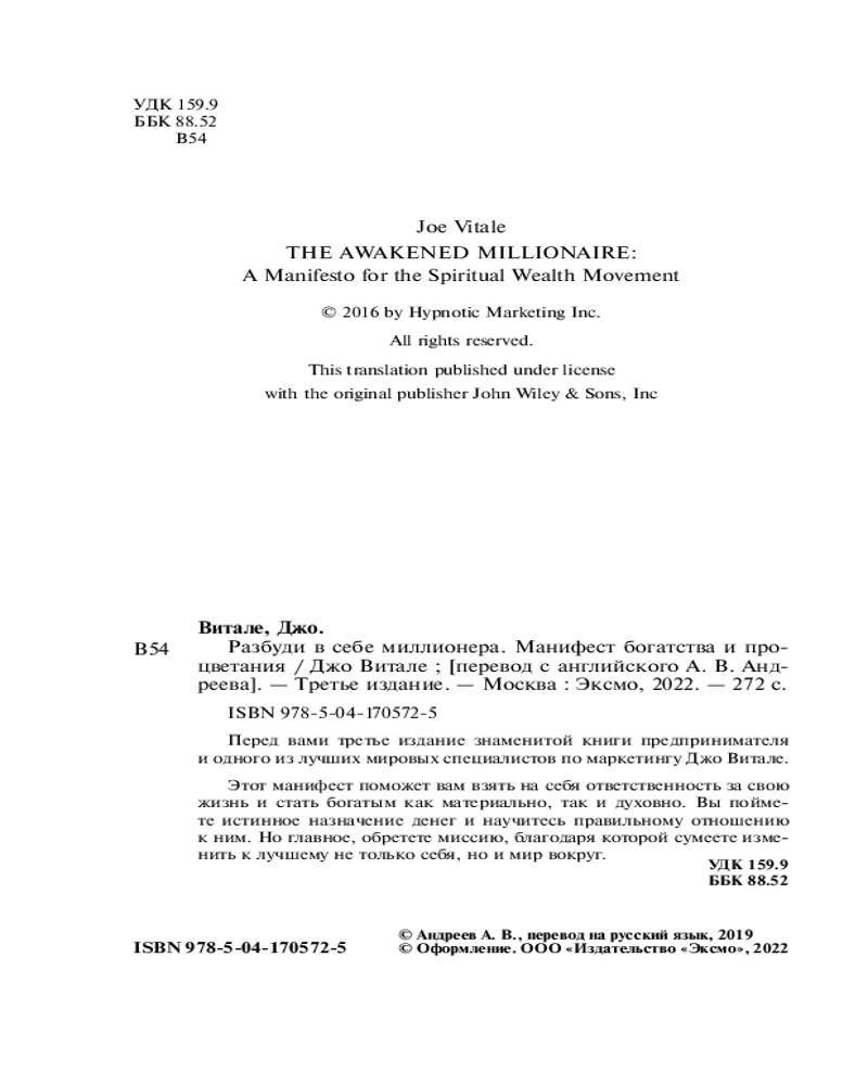 Серия: Сенсация Представляем третье издание книги, которая поможет вам избавиться от стереотипов, связанных с деньгами. Ее автор — Джо Витале, предприниматель, один из лучших мировых специалистов по маркетингу и автор книг по саморазвитию. Он предлагает нам уникальную систему, с помощью которой каждый сможет заработать миллионы, следовать своей миссии и помогать людям.