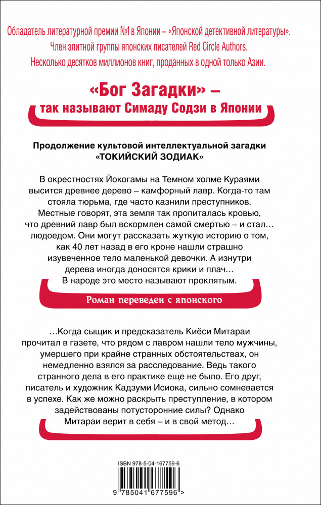 Дерево-людоед с Темного холмаВ данный момент этот товар отсутствует в продаже. Возможно, у нас найдется аналогичный или похожий товар здесь. Серия: Хонкаку-детектив Продолжение культовой интеллектуальной загадки «Токийский зодиак». |