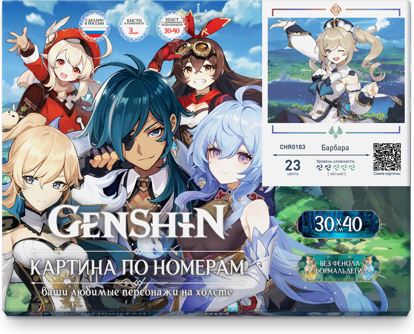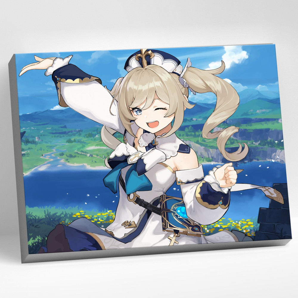 Барбара — юная девушка миниатюрного телосложения с пепельно-русыми волосами, собранными в два хвоста, и голубыми глазами. Она одета в белое, украшенное золотым шитьём, платье с открытыми плечами и тёмно-синей нижней юбкой и такого же цвета отворотами на рукавах. |