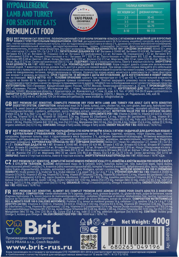 Brit Корм для взрослых кошек с ягненком и индейкой