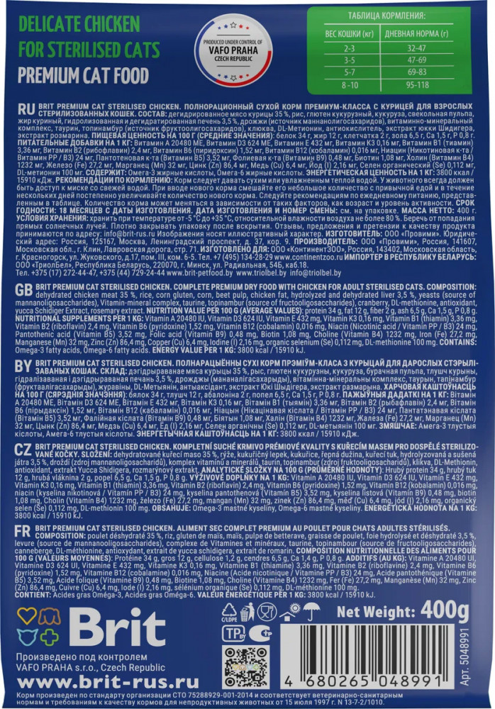 Brit Корм для взрослых стерилизованных кошек с курицей