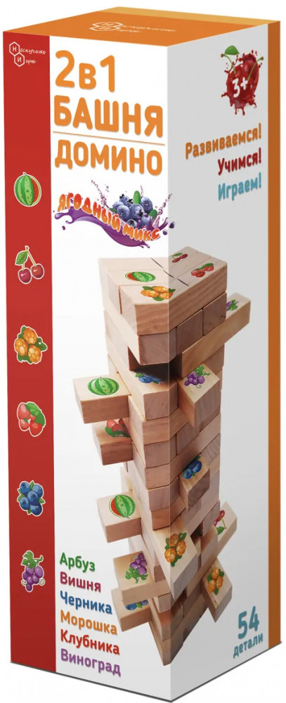 💳 Оплатить за товар можно при получении 🇰🇿 Есть бесплатная доставка по Казахстану 🎁 Копите бонусы с каждой покупки Башня — это увлекательная настольная игра. Известна в мире под разными названиями, такими, как «Дженга», «Пизанская башня», «Городок». Принцип достаточно прост: из ровных деревянных брусков строится башня (каждый новый «этаж» делается с чередованием направления укладки), а затем игроки начинают аккуратно вытаскивать по одному бруску и ставить его на верх башни. Домино «Ягодный микс» На 28 брусках нанесены рисунки 6 видов ягод для игры в классический вариант «Домино». Количество ягодок на грозди соотвествует цифре от 1 до 6. |