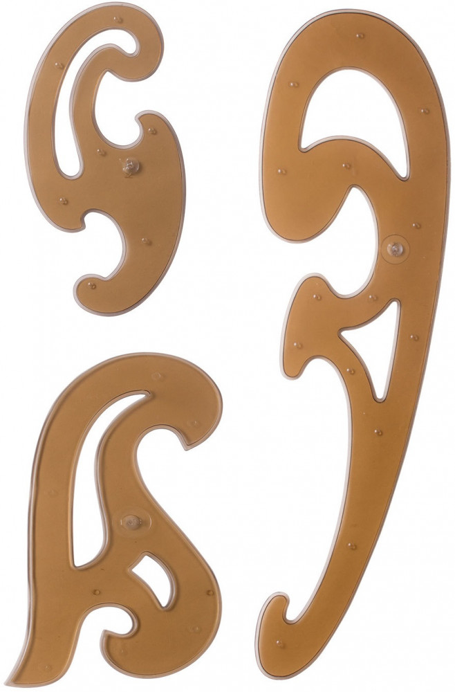 большое лекало — 31,5 × 9 см, маленькие лекала — 15,5 × 7 см и 13,5 × 6,5 см