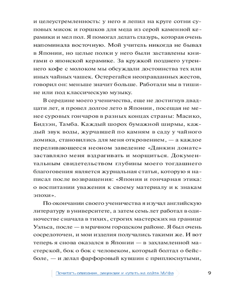 Мой учитель никогда не бывал в Японии, но целые полки у него были заставлены книгами о японской керамике. За кружкой позднего утреннего кофе с молоком мы обсуждали достоинства тех или иных чайных чашек. Остерегайся неоправданных жестов, говорил он: меньше значит больше.