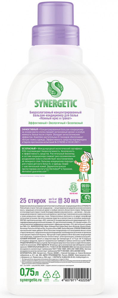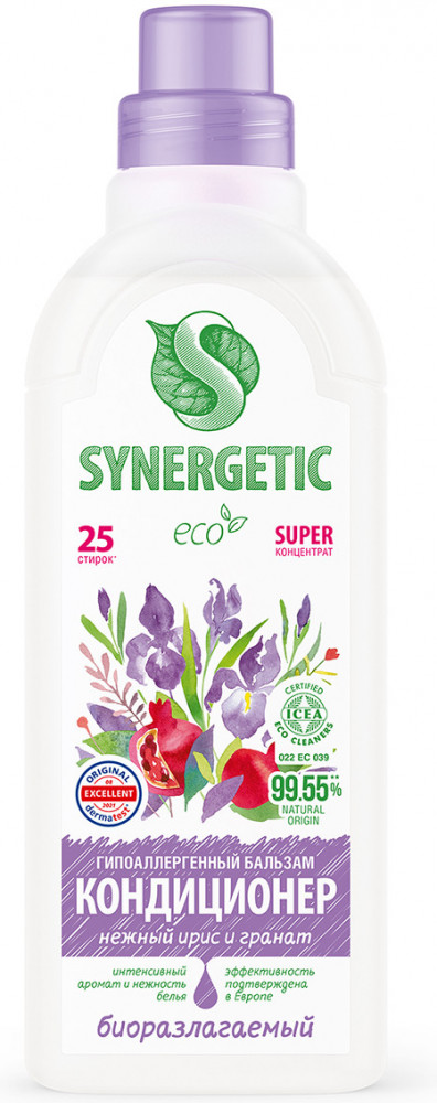 Биоразлагаемый концентрированный бальзам-кондиционер с нежным ароматом «Нежный ирис и гранат» на основе масла хлопка придает белью мягкость и способствует его быстрому высыханию после стирки. Средство обладает антистатическим эффектом, а содержащийся в нем комплекс растительных К-тензидов обеспечивает легкую глажку одежды. Эффективность подтверждена в Германии. Благодаря инновационному компоненту в составе — целлюлазе — бальзам-кондиционер помогает сохранить первоначальный вид белья, препятствует появлению катышков и ворсинок, а также разрушению структуры ткани, возвращая яркость цветам и гладкость поверхности тканей. Растительный биолипид снижает риск возникновения раздражения кожи и способствует восстановлению ее липидного слоя. Бальзам-кондиционер подходит для стирки детского белья 0+ и одежды людей с чувствительной кожей, удаляет остатки средств для стирки с тканей. Является гипоаллергенным и на 99% состоит из натуральных компонентов.