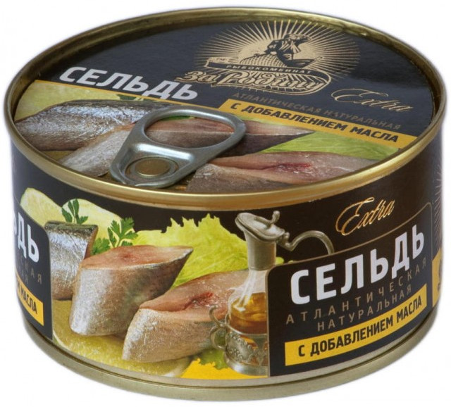 За Родину Сельдь атлантическая в масле+46 целые кусочки приятный вкус плотная укладка масла в меру крупные кусочки