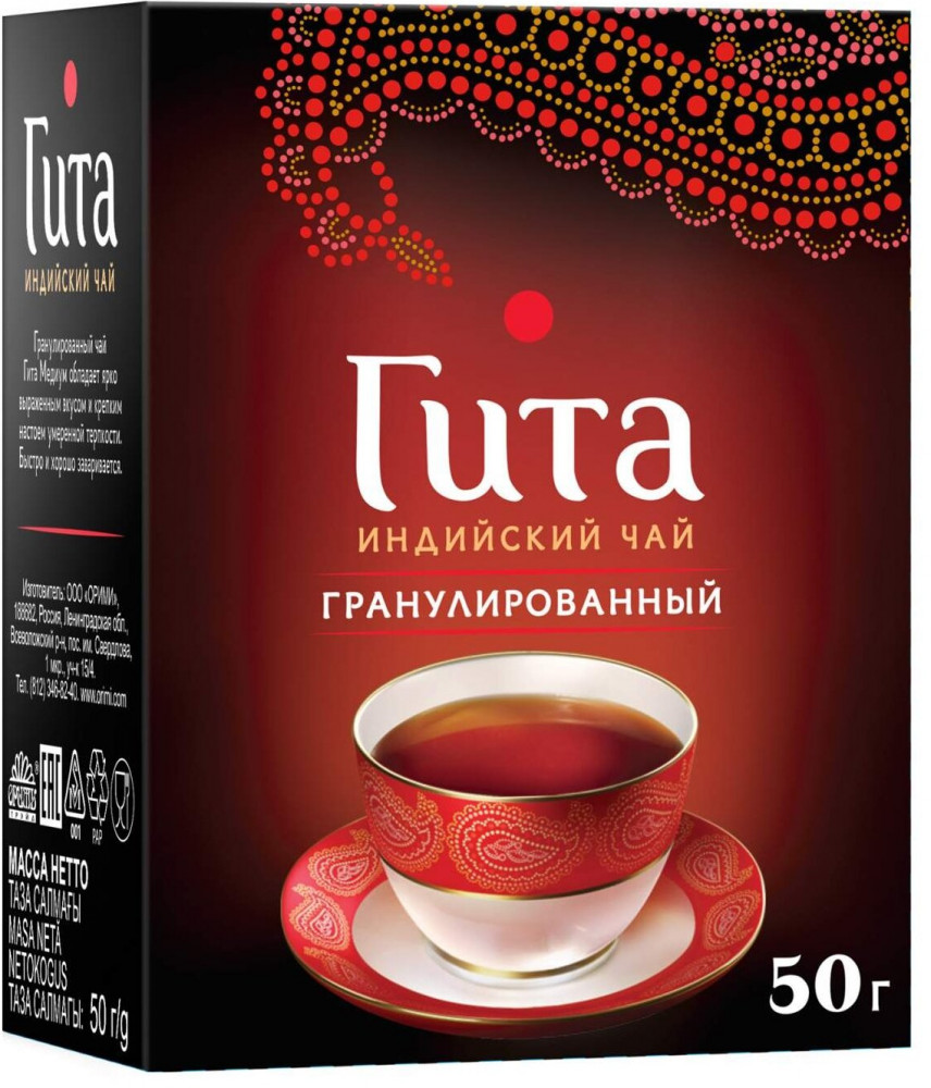 | Одна из самых демократичных и стабильных марок на чайном рынке России. В марке «Гита» представлены традиционные сорта черного индийского чая. Торговая марка «Гита» объединяет листовой, гранулированный, пакетированный чай, коллекцию черного ароматизированного чая. Бренду «Гита» присвоен независимый Знак качества Союза потребителей РФ «Лучшее в России». |