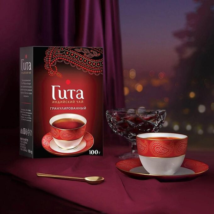 | Одна из самых демократичных и стабильных марок на чайном рынке России. В марке «Гита» представлены традиционные сорта черного индийского чая. Торговая марка «Гита» объединяет листовой, гранулированный, пакетированный чай, коллекцию черного ароматизированного чая. Бренду «Гита» присвоен независимый Знак качества Союза потребителей РФ «Лучшее в России». |