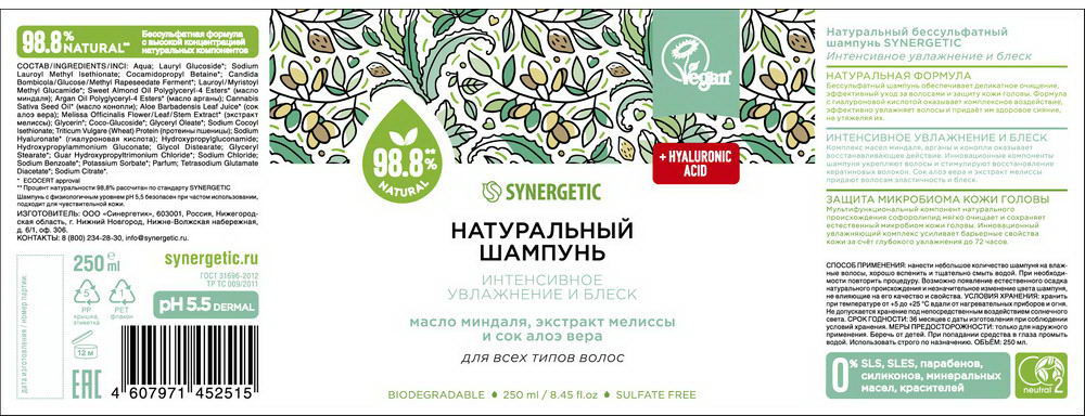 Synergetic Шампунь для волос бессульфатный «Интенсивное увлажнение и блеск»В данный момент этот товар отсутствует в продаже. Возможно, у нас найдется аналогичный или похожий товар здесь. Бессульфатный шампунь Synergetic «Интенсивное увлажнение и блеск» — эффективное средство для очищения кожи головы и всех типов волос — более чем на 98% состоит из натуральных компонентов. Шампунь деликатно очищает, эффективно ухаживает за волосами и защищает кожу головы. Формула с гиалуроновой кислотой оказывает комплексное воздействие, эффективно увлажняет волосы и придает им здоровое сияние, не утяжеляя. Натуральный шампунь содержит комплекс масел миндаля, арганы и конопли, который восстанавливает, питает и увлажняет волосы по всей длине. Активные компоненты в составе шампуня укрепляют волосы и стимулируют восстановление кератиновых волокон. Сок алоэ вера и экстракт мелиссы придают волосам эластичность и блеск. Мультифункциональный компонент натурального происхождения софоролипид мягко очищает кожу головы и сохраняет естественный микробиом, а инновационный увлажняющий комплекс усиливает барьерные свойства кожи и обеспечивает до 72 часов глубокого увлажнения. Физиологичный уровень pH 5,5 устраняет сухость кожи головы и гарантирует безопасность при частом использовании средства даже для чувствительной кожи. Натуральный шампунь не содержит SLS, SLES, парабенов, силиконов, минеральных масел и красителей, а также компонентов животного происхождения, не тестируется на животных и сертифицирован британской организацией The Vegan Society. Знак Vegan — мировой стандарт этичной продукции. |