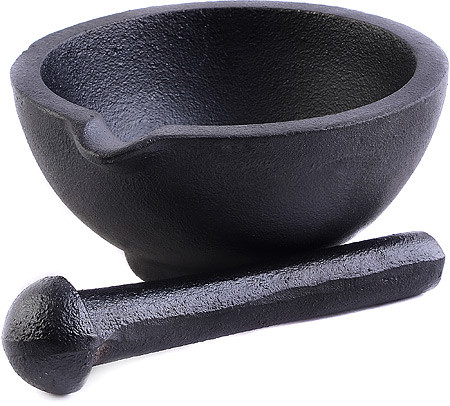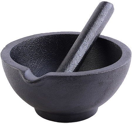 Ступка с пестиком изготовлен из чугуна, традиционного высокопрочного и экологически чистого материала. Известно, что пища, приготовленная в чугунной посуде, сохраняет свои вкусовые качества, и благодаря экологической чистоте материала, не может нанести вред здоровью человека.
