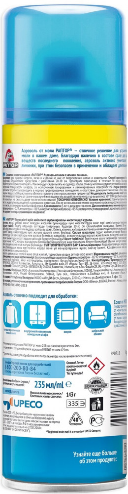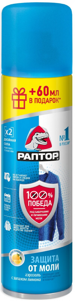 Серия: Раптор моль Любите жить в темпе и не готовы ждать? В отличие от вас, моль никуда не торопится и, пока вы мчитесь на очередную деловую встречу или в спортзал, спокойно доедает ваш любимый свитер. Для тех, кто предпочитает быстрые решения, идеально подойдёт аэрозольное средство от моли РАПТОР моментального действия! |