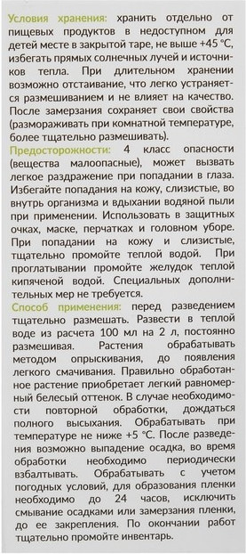 💳 Оплатить за товар можно при получении 🇰🇿 Есть бесплатная доставка по Казахстану 🎁 Копите бонусы с каждой покупки Высокоэффективное средство защиты растений от поражения критически низкими температурами. Образует защитную пленку, которая препятствует потере влаги от «вымораживания» из-за низких температур и ветра. Пленка не препятствует здоровому процессу фотосинтеза и дыхания растения. Состав пленки делает ткани растений более прочными и пластичными, снижает температуру замерзания клеточной жидкости, повышает морозоустойчивость. Результат применения — повешенное выживание растений при низкотемпературном климатическом воздействии. |