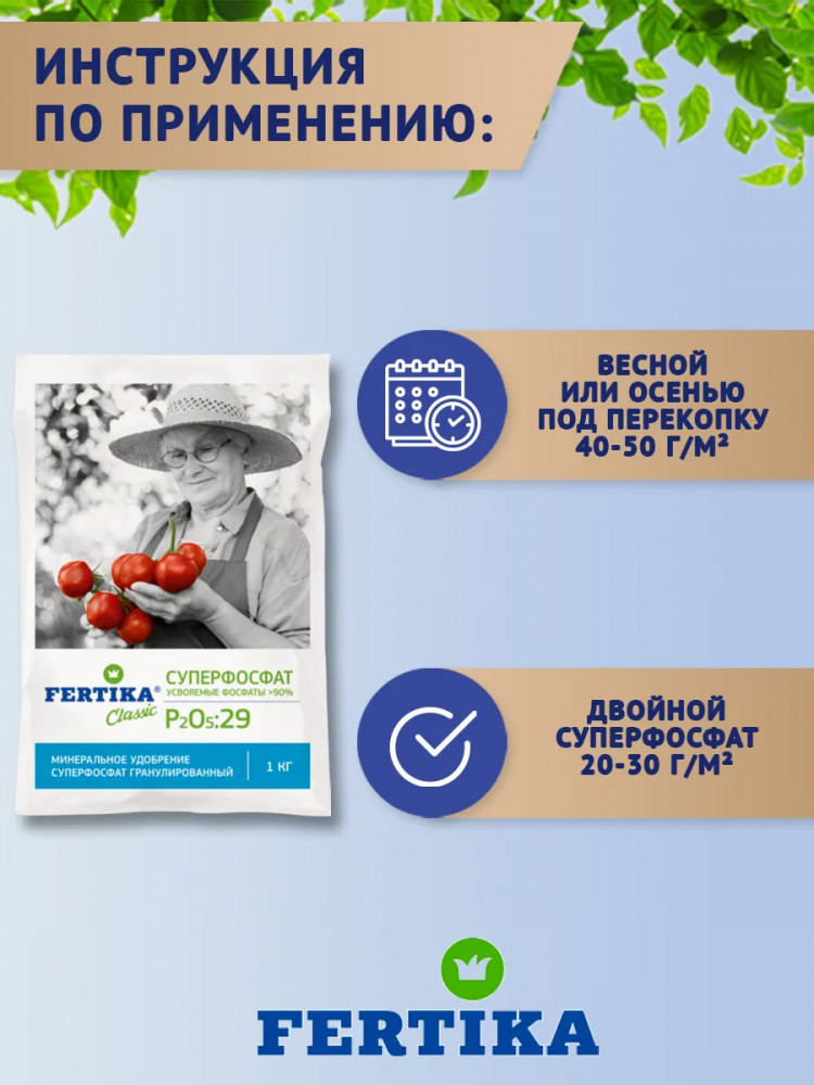 Fertika Удобрение «Суперфосфат»увеличение урожая для плодовых для малины простота применения В данный момент этот товар отсутствует в продаже. Возможно, у нас найдется аналогичный или похожий товар здесь. Высокоэффективное гранулированное фосфорное удобрение. Используется на различных типах почв (в том числе в условиях защищенного грунта). Способствует развитию мощной корневой системы. Гарантирует ускорение созревания и повышение урожайности, улучшает качество продукции. Используется для основного внесения (при подготовке почвы весной и осенью), предпосевного (в рядки, борозды или лунки), а также для подкормки в течение вегетационного периода. При подготовке участка к посеву растений простой суперфосфат вносят весной или осенью под перекопку, в среднем расходуя около 40-50 г удобрения на 1 м². Двойной суперфосфат вносят из расчета 20-30 г на 1 м². |