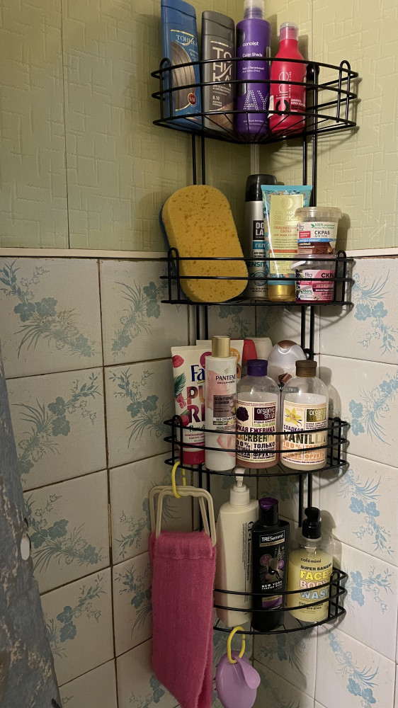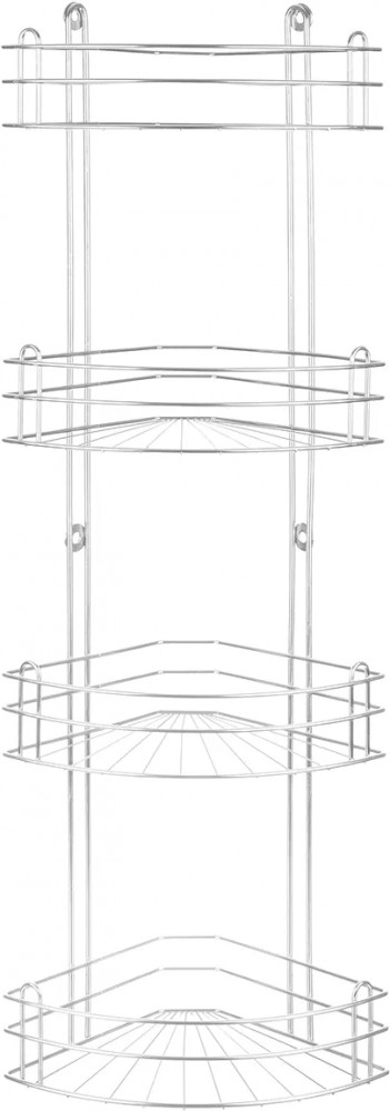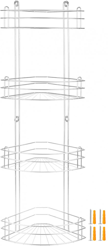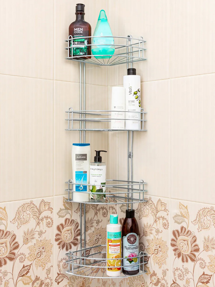 Четырехъярусная угловая полка для ванной выполнена из металла. Имеет отверстия для крепления на стену. В комплекте идут 4 самореза и 4 дюбеля. 4 яруса имеют стенки со всех сторон. Ярусная этажерка устойчива к коррозии. Выдерживает общую нагрузку до 20 кг. Полки с отверстиями не удерживают влагу. Подвесной набор идеально подходит для душевой кабинки и ванной комнаты. Разместите на полочках гели, шампуни, мочалки, дозаторы с жидким мылом, моющие принадлежности и аксессуары для ванной. Навесной органайзер можно использовать и в других комнатах: гостиной, спальне, на кухне или балконе. Металлический настенный стеллаж создаст новые места для хранения и поможет организовать пространство. Такая полка — подставка эстетично выглядит и сможет украсить любой интерьер!