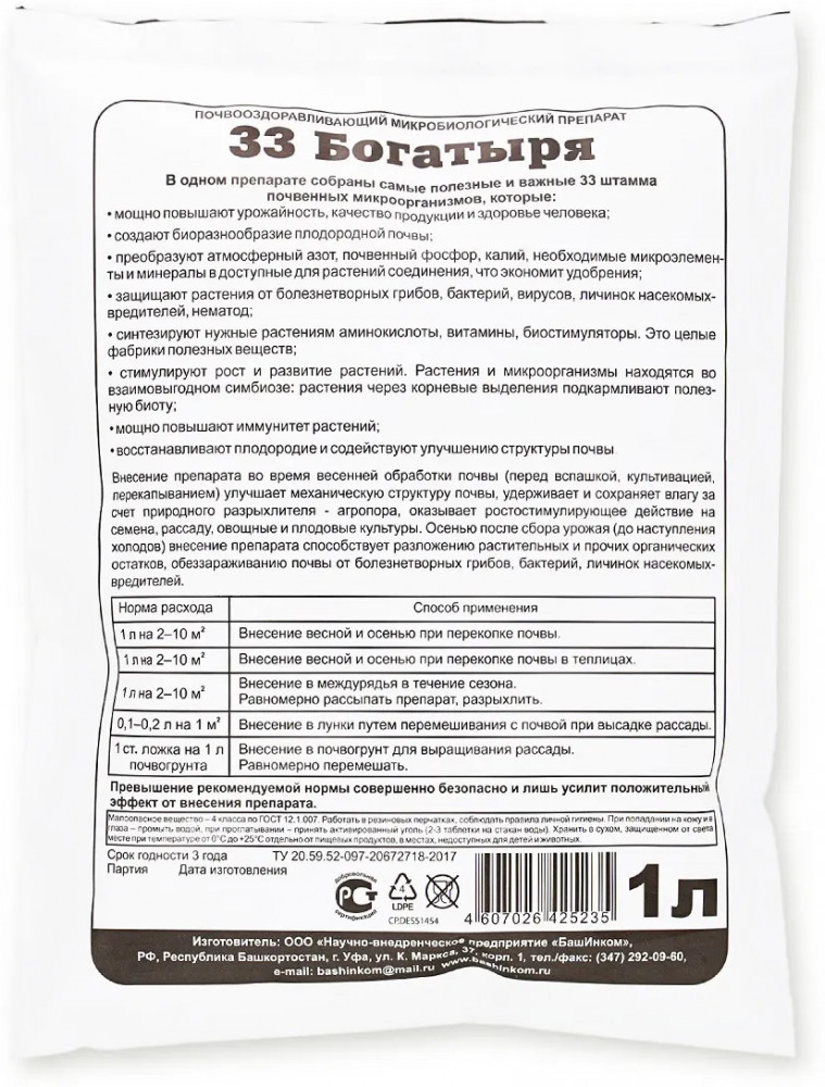 💳 Оплатить за товар можно при получении 🇰🇿 Есть бесплатная доставка по Казахстану от 1 дня 🎁 Копите бонусы с каждой покупки Серия: 33 богатыря Уникальный почвооздоравливающий, оживляющий, восстанавливающий плодородие почвы микробиологический препарат. Он содержит более 40 штаммов полезных почвенных микроорганизмов на органическом и минеральном носителе. Все штаммы препарата взяты из природы и усилены селекцией. Каждая разновидность микроорганизмов находится в своём «домике», поэтому они не мешают друг другу и выполняют разнообразные функции. Норма расхода: 1 столовая ложка на 1 литр почвогрунта — внесение в почвогрунт при выращивании рассады, равномерно перемешать. |