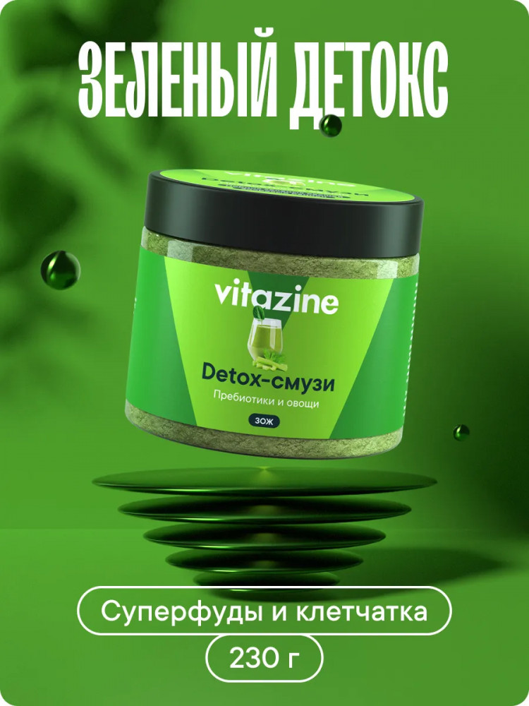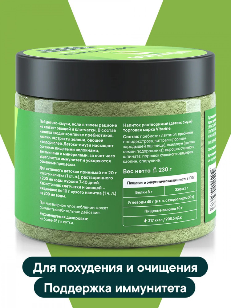 Vitazine Напиток детокс-смузи растворимыйВ данный момент этот товар отсутствует в продаже. Возможно, у нас найдется аналогичный или похожий товар здесь. Биологически активный детокс-напиток из пребиотиков и овощей — простое решение проблемы недостатка в рационе зелени и пищевых волокон. |