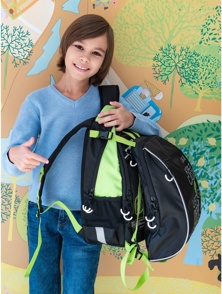 Твердая спинка, мешок для сменной одежды, вшитые светоотражающие ленты, много кармашков.