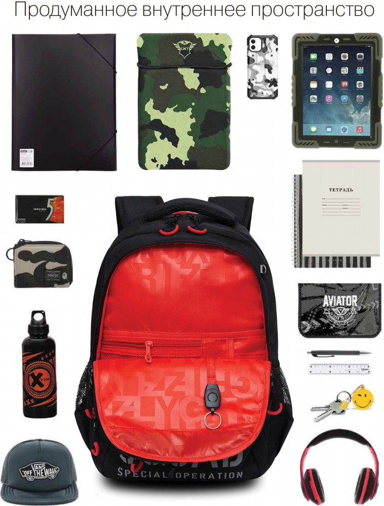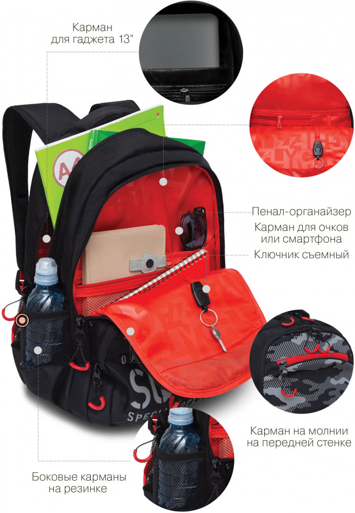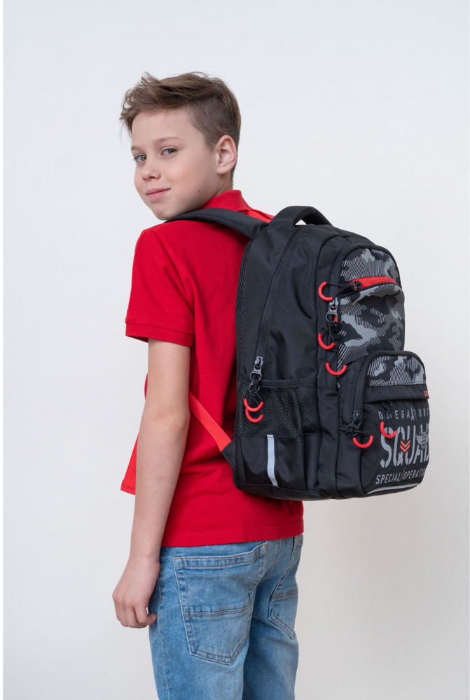 Очень много доп карманов, сыну очень нравится. Спинка ортопедическая