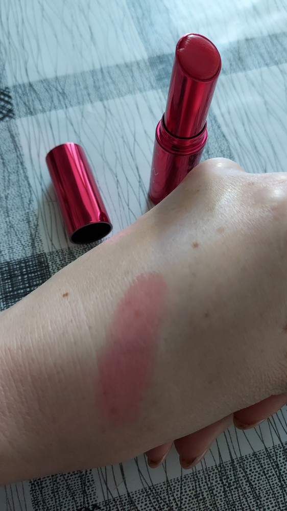 полупрозрачный алый цвет, увлажнение есть но совсем сухим губам не поможет
