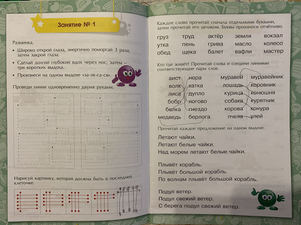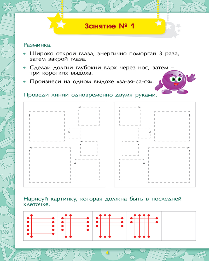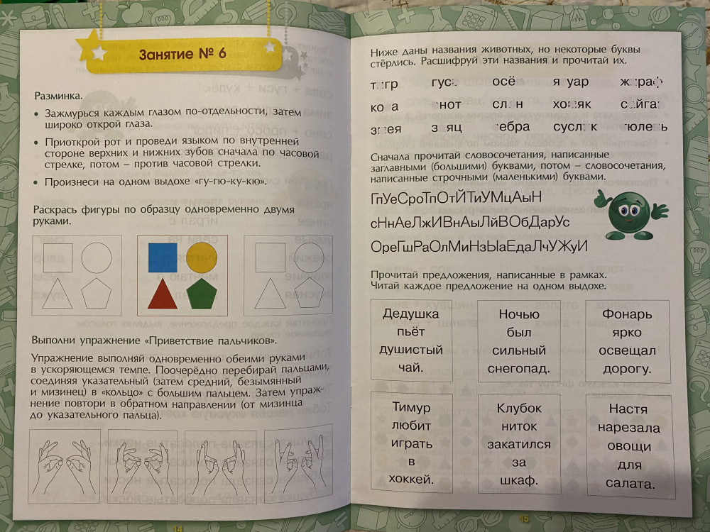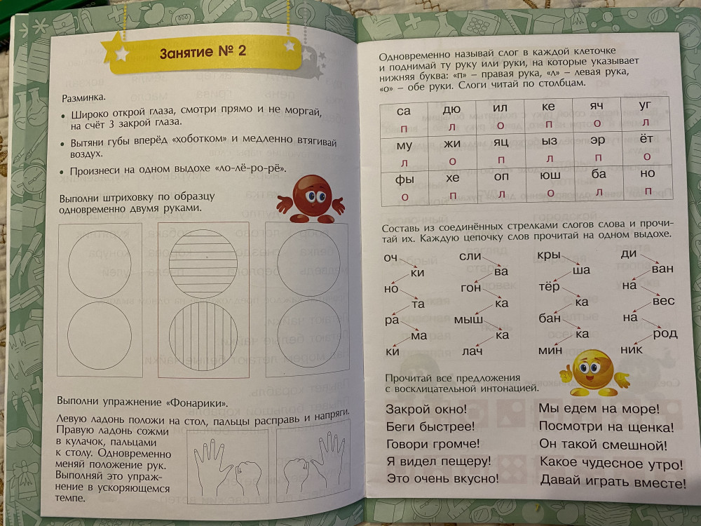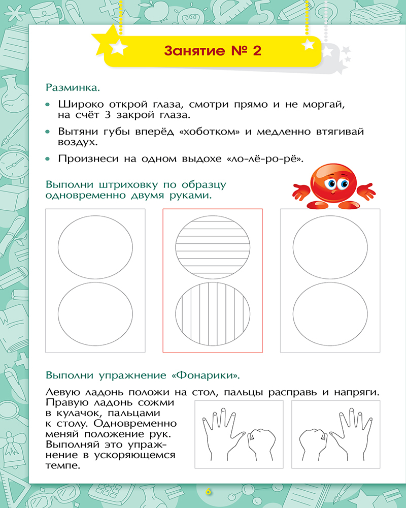 В данное пособие включены занимательные упражнения, направленные на тренировку вышеперечисленных навыков, которые помогут существенно увеличить скорость чтения и качество восприятия прочитанного материала. Каждое занятие начинается с разминки, в которой все упражнения рекомендуется повторять 3 раза. После разминки представлено графическое задание, которое выполняется одновременно левой (левое поле) и правой (правое поле) руками. На второй странице каждого занятия даны задания по чтению, которые ребёнок должен стараться выполнять быстро и чётко. Если с первого раза это не удаётся, нужно повторить задание ещё раз.