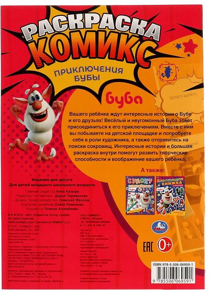 💳 Оплатить за товар можно при получении 🇰🇿 Есть бесплатная доставка по Казахстану от 1 дня 🎁 Копите бонусы с каждой покупки Раскраска-комикс «Приключения Бубы» обязательно понравится маленьким поклонникам мультсериала «Буба»: |