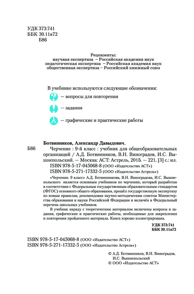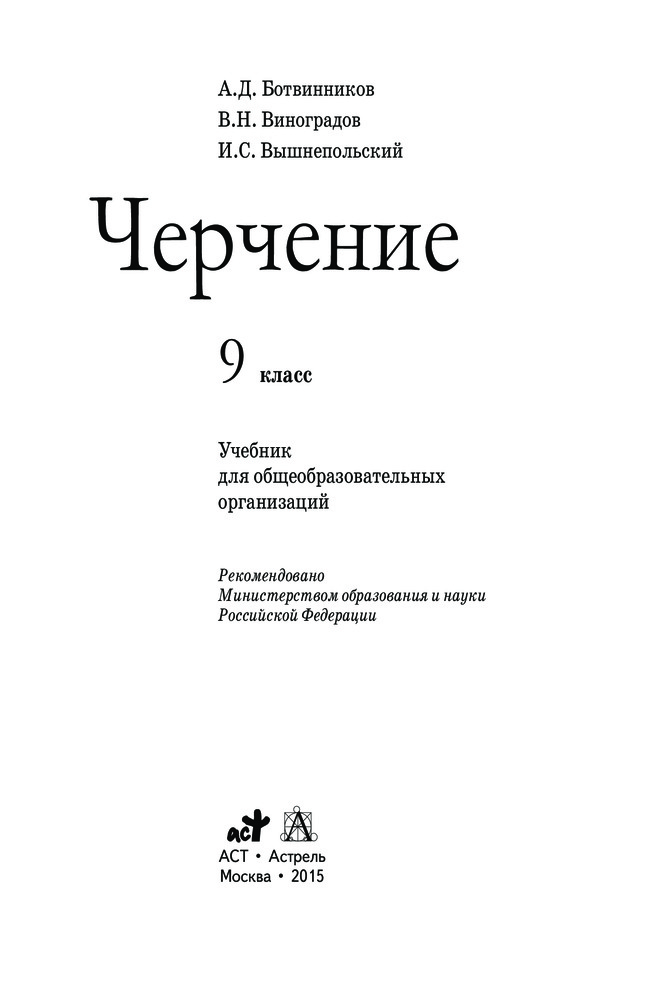 Черчение. 9 классАлександр Давыдович Ботвинников, В. Н. Виноградов, Вышнепольский Игорь Самуилович В данный момент этот товар отсутствует в продаже. Возможно, у нас найдется аналогичный или похожий товар здесь. Данная книга является основным учебником по черчению, который соответствует действующей программе, утвержденной Министерством образования Российской Федерации. В учебник наряду с теоретическим материалом включены вопросы и задания, графические и практические работы, необходимые для закрепления и повторения пройденного материала. Книга хорошо иллюстрирована. |
