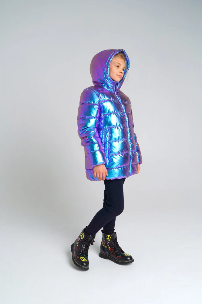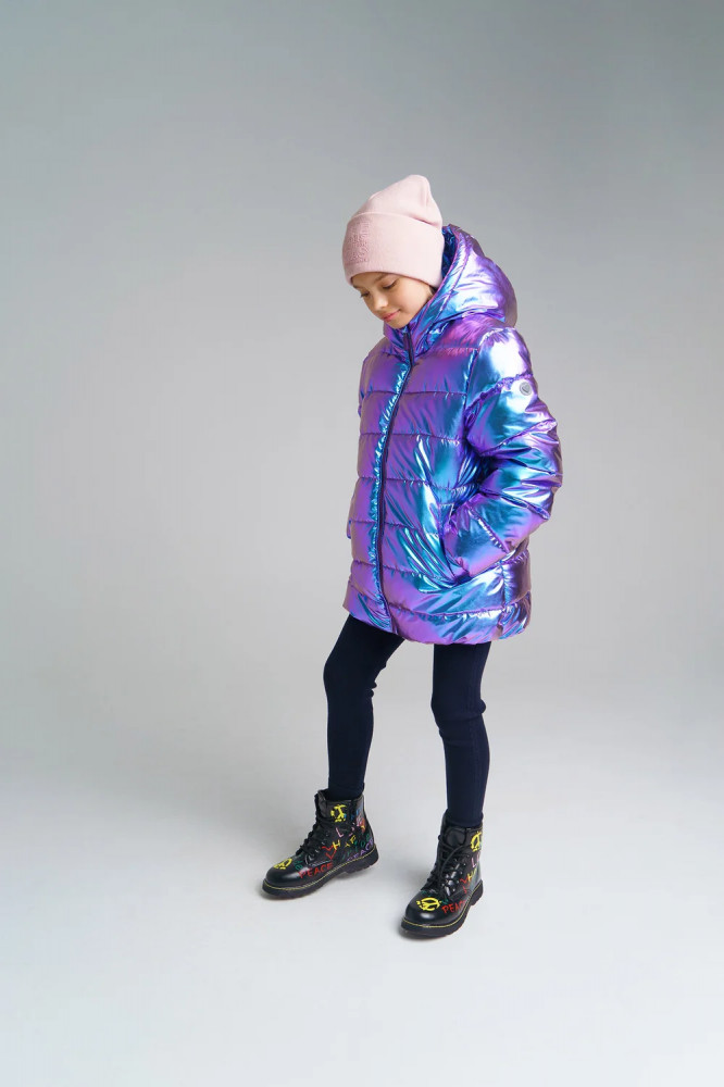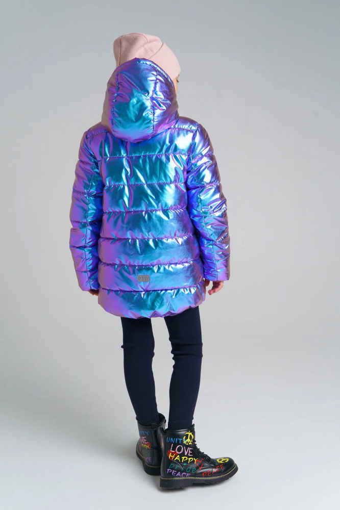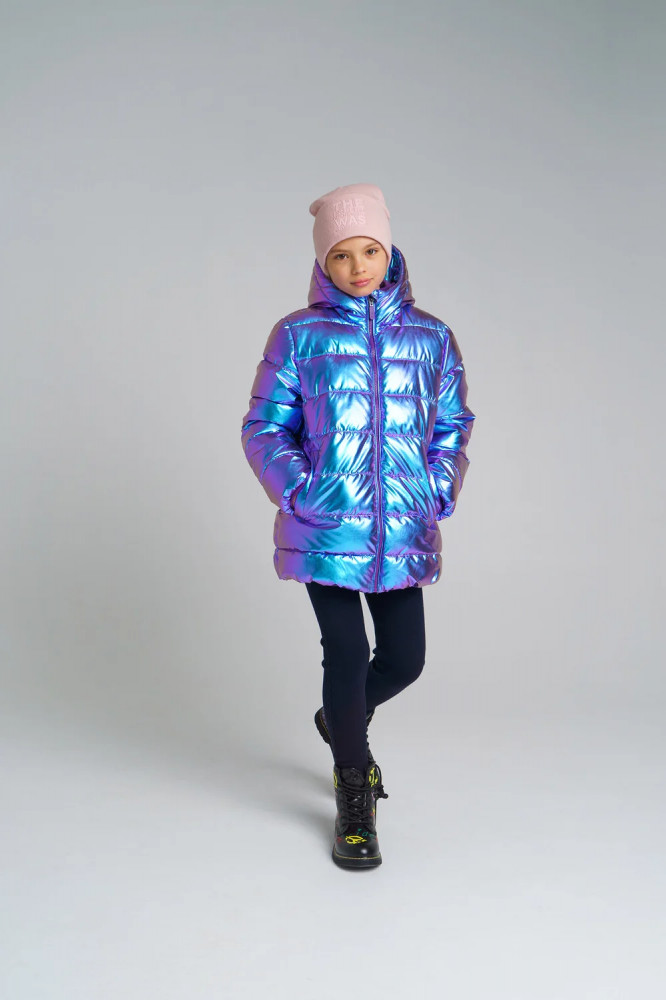Куртка как на фотографии. Цвет и голубой, и синий, переходящий в фиолетовый. Цвета играют и переливаются один в другой. Добротная, очень хорошая куртка для девочек подростков и не только. На флисе, подклад мягкий. Капюшон глубокий, не отстёгивается. Дочь в восторге полном. Спасибо, Флип!и фирма Плэй Тудэй.