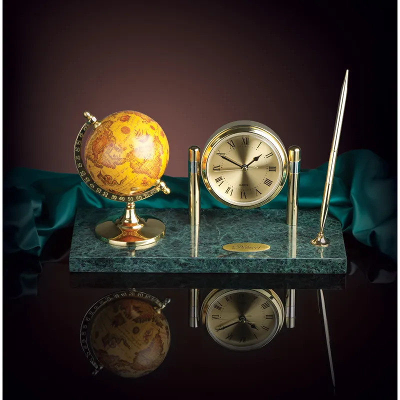 Delucci Подставка под ручкуВ данный момент этот товар отсутствует в продаже. Возможно, у нас найдется аналогичный или похожий товар здесь. Элегантная подставка под ручку с глобусом и часами Delucci может стать замечательным украшением рабочего стола. Корпус выполнен из зелёного мрамора, а фурнитура — из прочного металла. Глобус диаметром 9 сантиметров и часы сделают подставку под ручку многофункциональной. В комплекте ручка с синими чернилами и батарейка. Подставка под ручку Delucci упакована в бордовую коробку. |