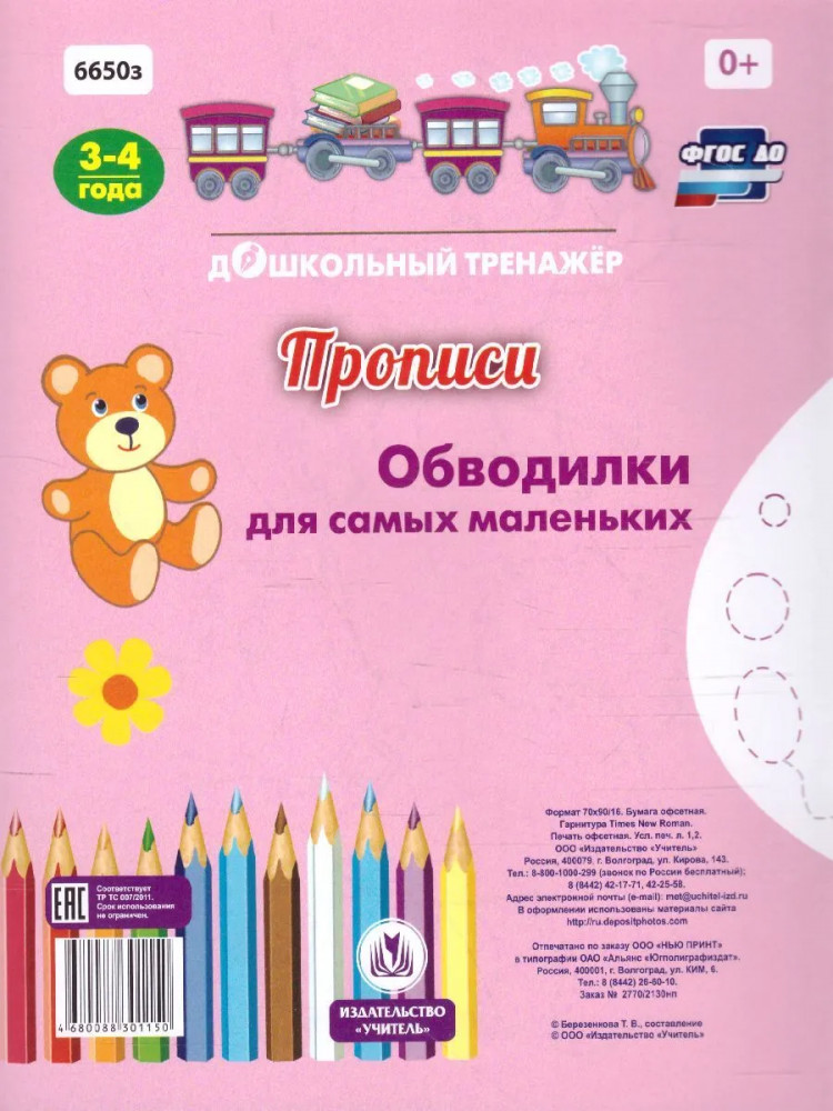 Прописи «Обводилки для самых маленьких»Татьяна Валерьевна Березенкова В данный момент этот товар отсутствует в продаже. Возможно, у нас найдется аналогичный или похожий товар здесь. Серия: Дошкольный тренажер. Прописи Упражнения «Обводилки» являются одним из первых шагов в овладении навыками рисования и подготовки руки к письму. Упражнения в обведении по контурным линиям помогут скоординировать движения кистей рук малыша, научат правильно удерживать карандаш, регулировать силу нажима при рисовании. Ребенку предлагается обвести контур рисунка по точкам и пунктирным линиям, а после того как рисунок приобретёт целостный вид, раскрасить его на свое усмотрение. |