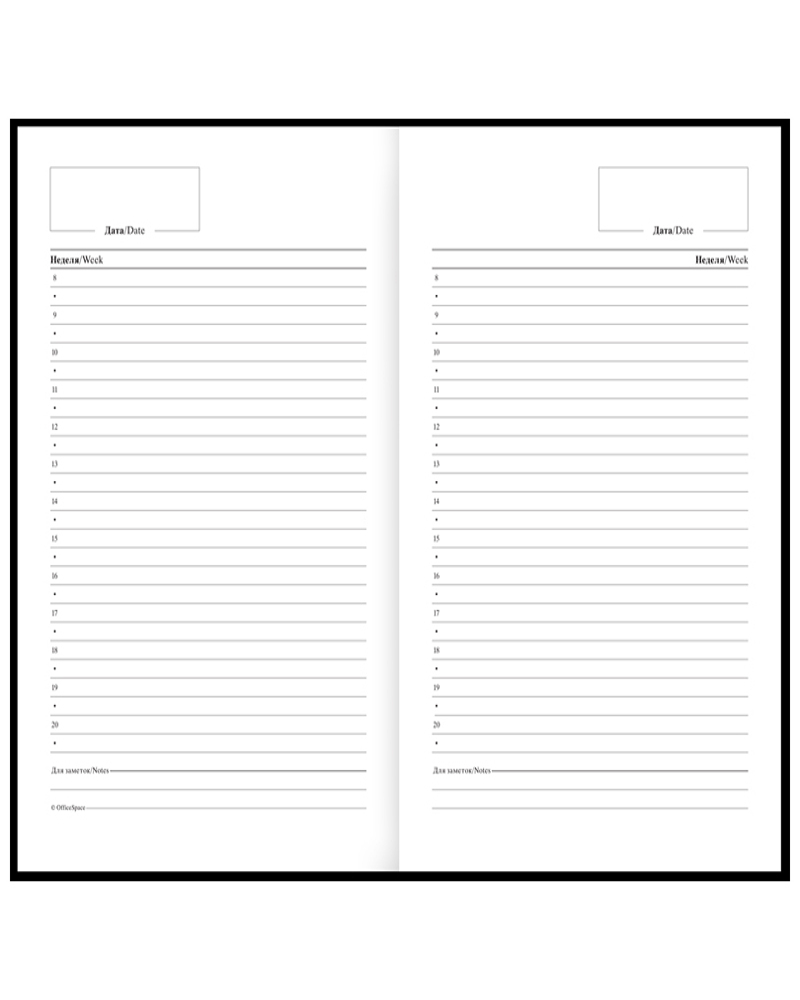 Ежедневник OfficeSpace отлично подойдёт для планирования встреч, звонков и переговоров. Обложка из твёрдого картона с ламинацией позволяет сохранять внешний вид ежедневника таким же, как и во время покупки. Внутренний блок содержит прошитые листы листов из белой офсетной бумаги плотностью 65 г/м2. Блок содержит справочный материал и календарную сетку на 4 года, включая текущий.