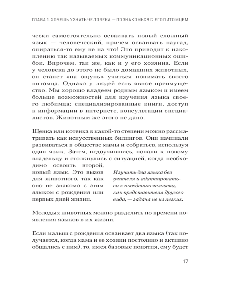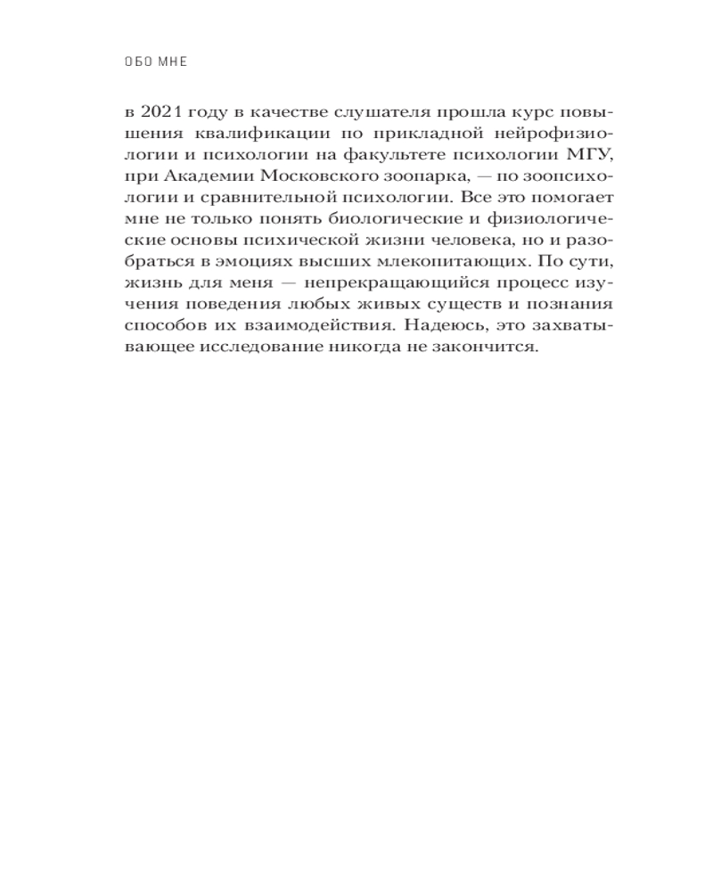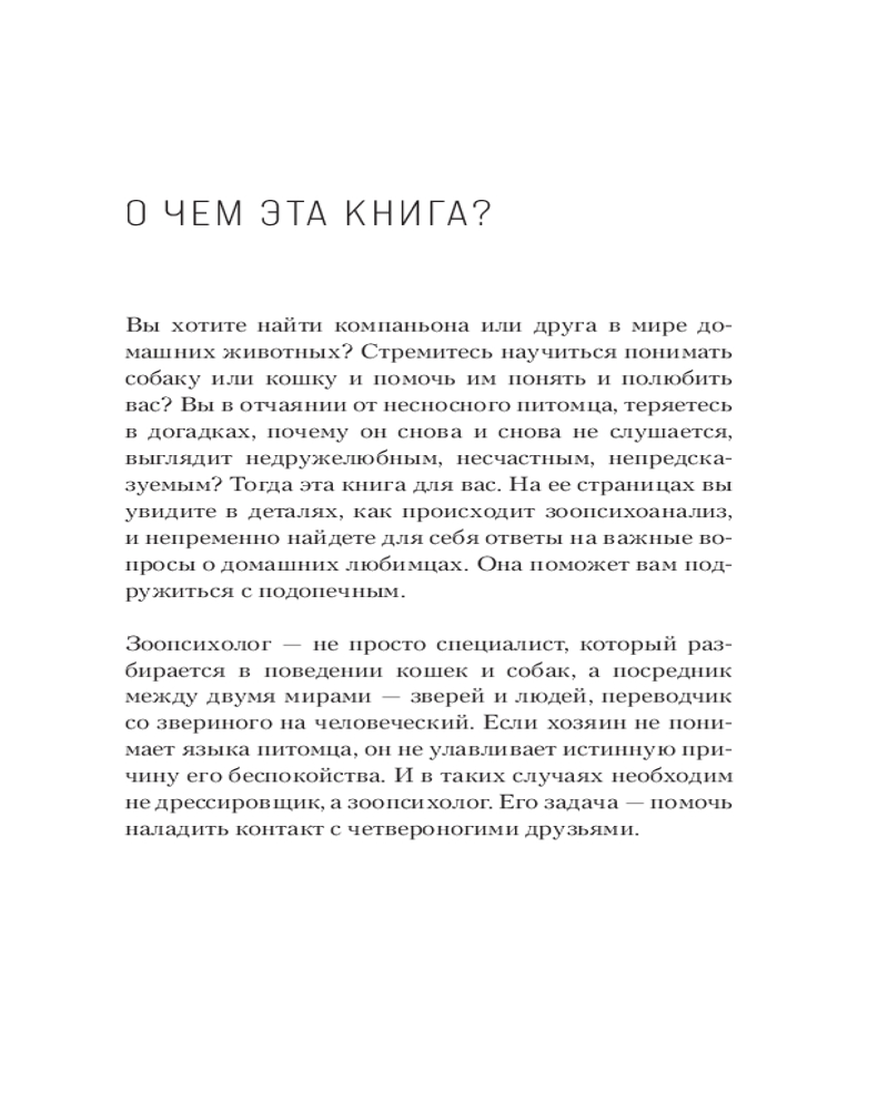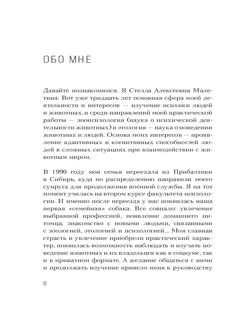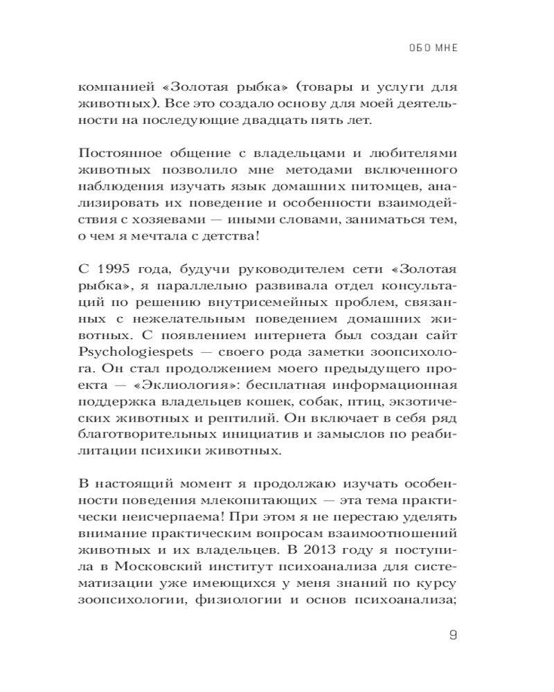 Автор — не просто специалист, который разбирается в том или ином поведении собак и кошек, но и переводчик со звериного языка на человеческий, связующее звено между миром людей и миром животных. Была руководителем сети услуг и зоомагазинов, активно развивала отдел содействия по решению внутрисемейных проблем, связанных с домашними питомцами.