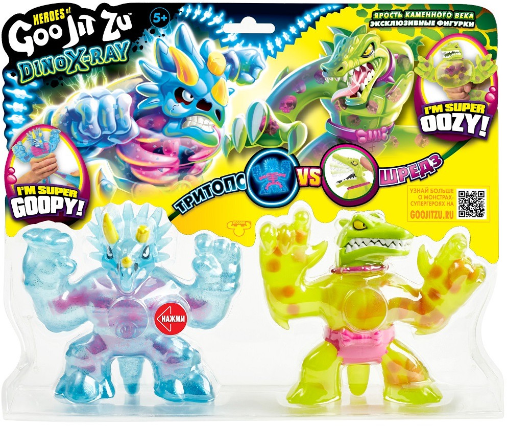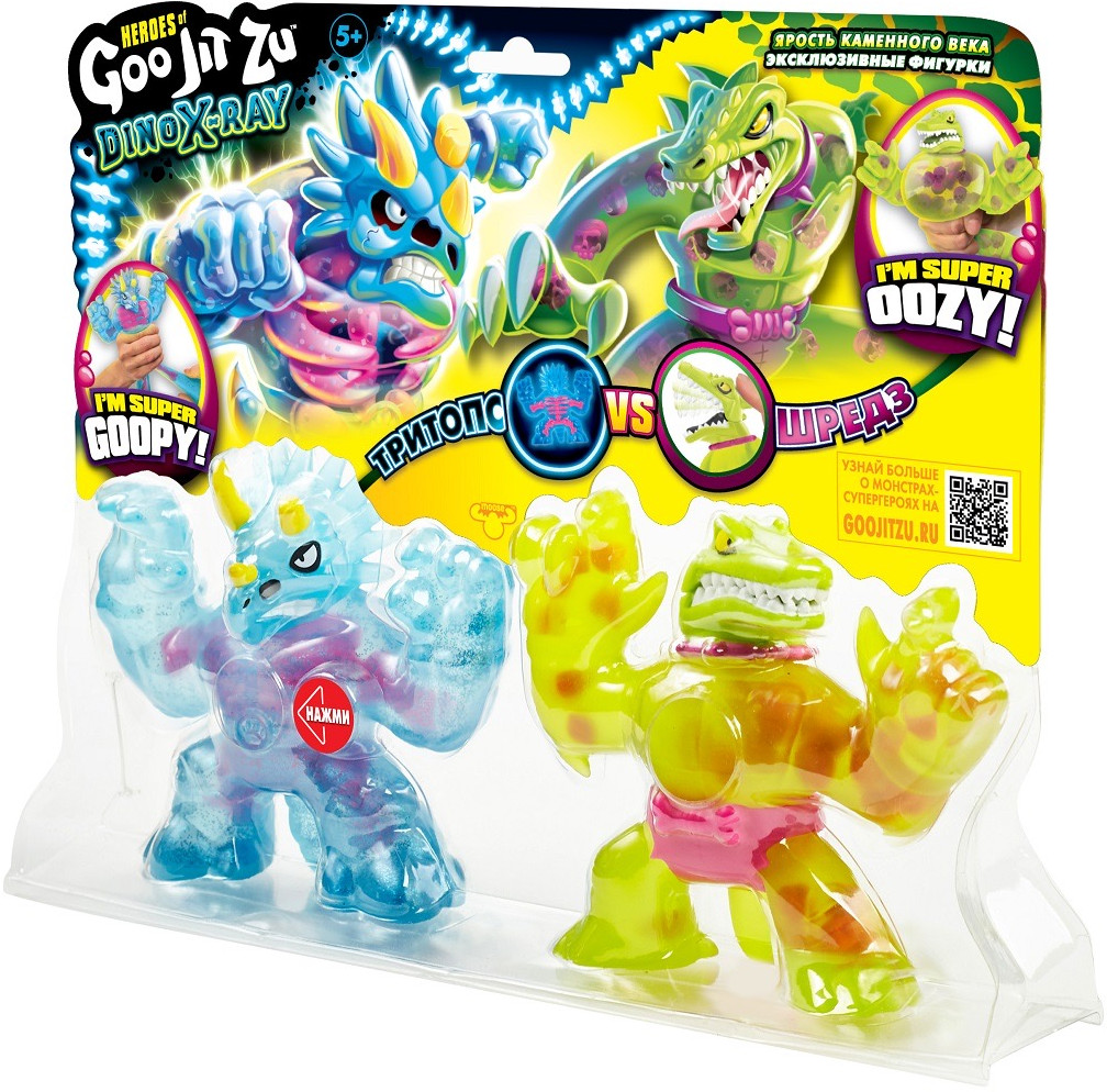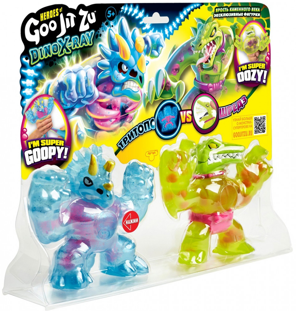 Вау! Теперь у них есть кости! Герои Гуджитсу возвращаются в новой серии Дино Икс-Рэй! Игровой набор 'Ярость каменного века' с двумя эксклюзивными персонажами ждет тебя. Мощный Дино-скелет против Боевых челюстей! Тритопс любит похрустеть своими костями в битвах, в то время как Шредз использует свои Боевые челюсти, чтобы напугать врагов.