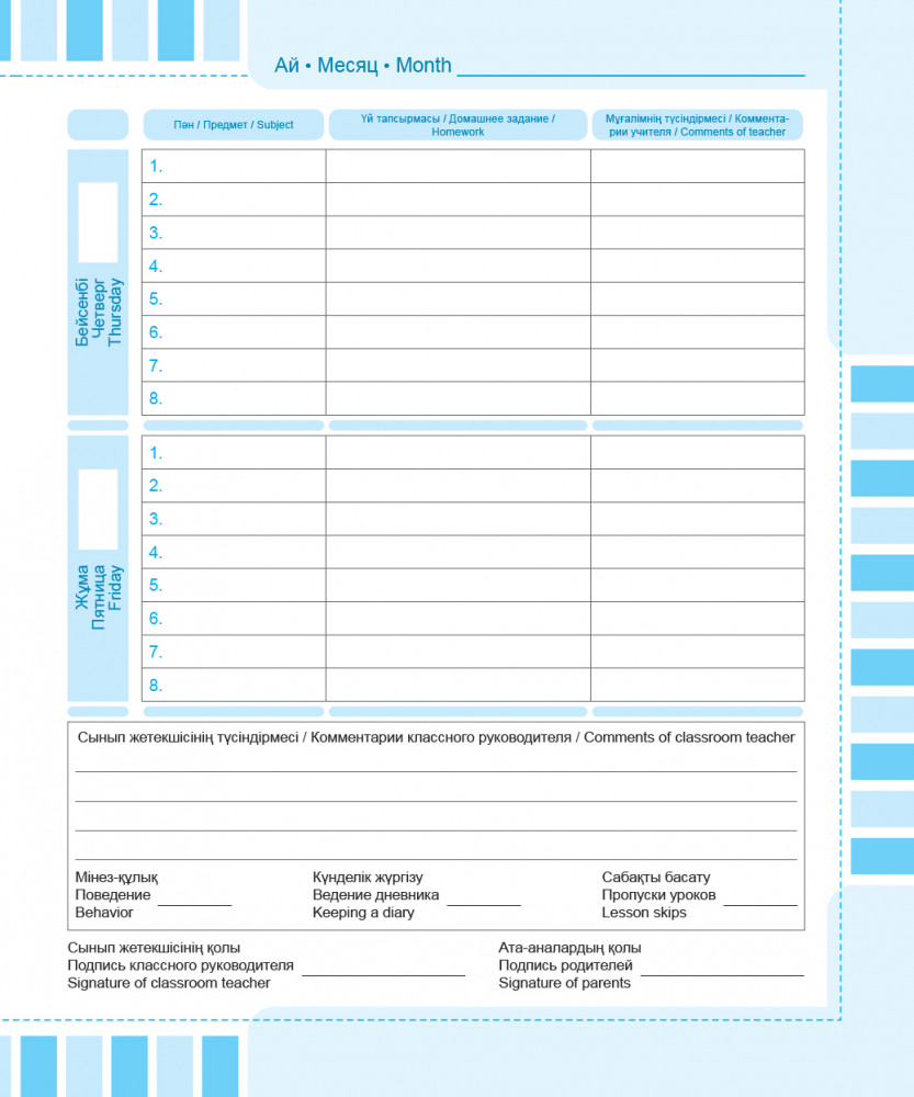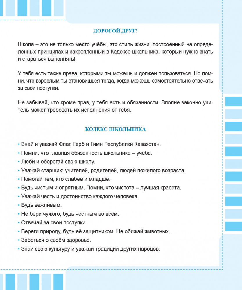 Дневник. Күнделік. Diaryкачественный школьный формат покупают снова В данный момент этот товар отсутствует в продаже. Возможно, у нас найдется аналогичный или похожий товар здесь. Дневник школьный с пятидневной учебной неделей, 3-х язычный (казахский, русский, английский). Дневник включает дополнительный материал: кодекс школьника; правила безопасности на улице; мониторинг читательской грамотности и критерии оценки техники чтения. |