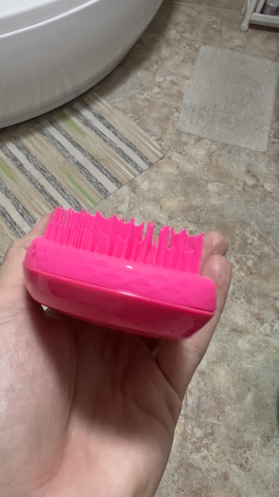 Покупала доче, за год она так и не смогла к ней приловчиться, теперь заказала с ручкой. А сама расческа за год практически в том же состоянии, ни один зубчик не сломался.
