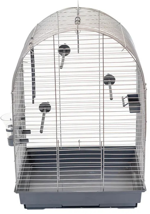 Клетка для птиц металлическая на пластиковом поддоне с вынимающейся вставкой. Клетка имеет полукруглую форму. Конструкция разборная — 4 стенки и крыша. Дверца — в передней (длинной) стенке. Передняя и задняя стенка имеют горизонтальные прутья (расстояние между прутьями — 12,5 мм) для возможности лазания по стенке. Боковые стенки имеют вертикальные прутья (расстояние между