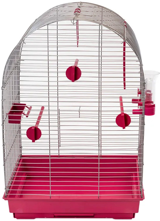 Клетка для птиц металлическая на пластиковом поддоне с вынимающейся вставкой. Клетка имеет полукруглую форму. Конструкция разборная — 4 стенки и крыша. Дверца — в передней (длинной) стенке. Передняя и задняя стенка имеют горизонтальные прутья (расстояние между прутьями — 12,5 мм) для возможности лазания по стенке. Боковые стенки имеют вертикальные прутья (расстояние между