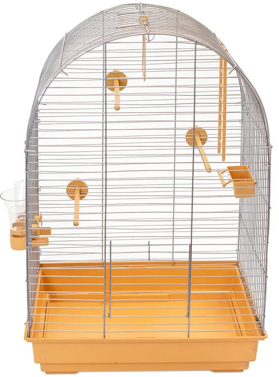 Клетка для птиц металлическая на пластиковом поддоне с вынимающейся вставкой. Клетка имеет полукруглую форму. Конструкция разборная — 4 стенки и крыша. Дверца — в передней (длинной) стенке. Передняя и задняя стенка имеют горизонтальные прутья (расстояние между прутьями — 12,5 мм) для возможности лазания по стенке. Боковые стенки имеют вертикальные прутья (расстояние между