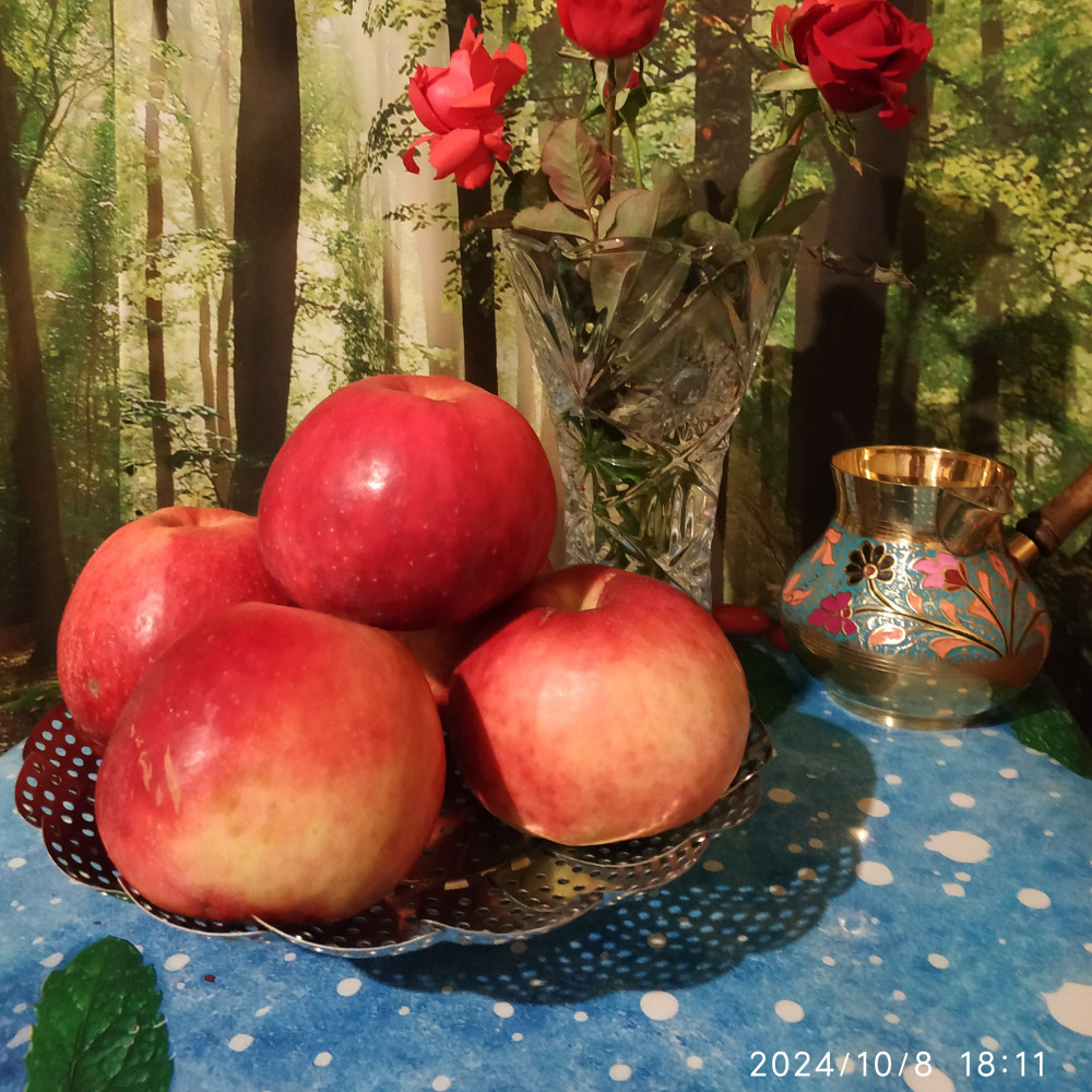 очень красивая,что я сделала фото вместе с цветами и фруктами