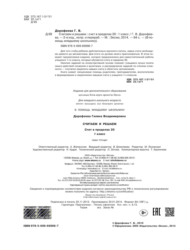 Для того чтобы ребенок действительно научился считать, навык счета необходимо довести до автоматизма. Для этого он должен много практиковаться. В этом поможет предлагаемое издание, которое предназначено для самостоятельной работы учащихся 1-го класса, которые обучаются счету в пределах 20. Наличие заданий на иллюстративной основе поможет учащимся лучше понять смысл действий сложения и вычитания, а распределение заданий по степени сложности — поэтапно закрепить навыки счета и облегчить запоминание. Книга окажет неоценимую помощь родителям, преподавателям, воспитателям в формировании и закреплении навыков счета у учащихся 1-х классов.