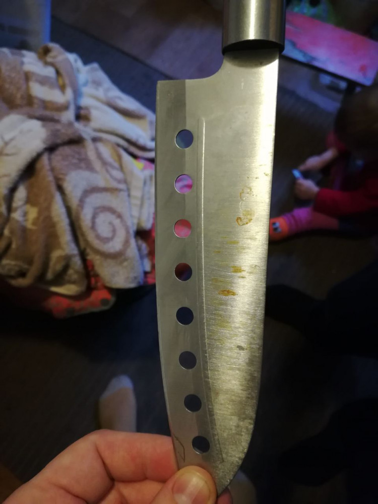 Ножи этой фирмы после мытья в посудомоечной машине (о возможности мытья в ПММ ранее указывалось на сайте) покрылись ржавчиной! Если их мыть вручную, то проблем нет, режут хорошо. На фото один из ножей из данного набора.