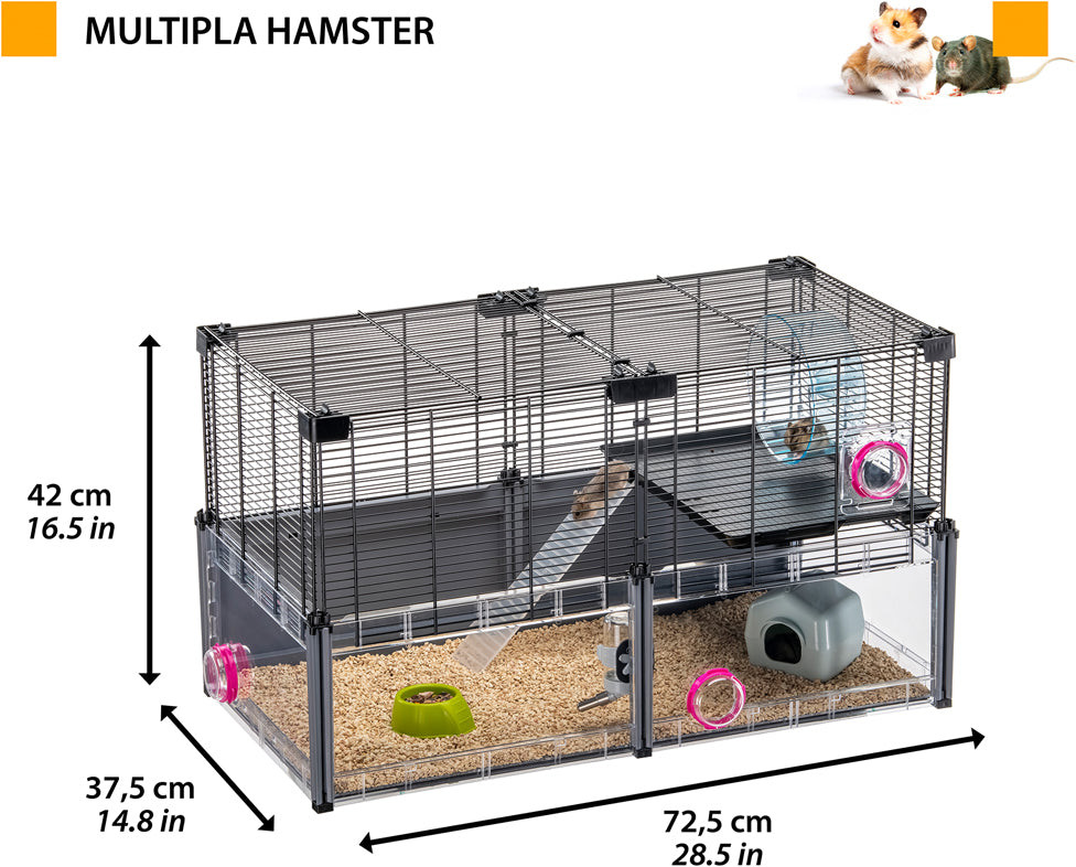 В данный момент этот товар отсутствует в продаже. Возможно, у нас найдется аналогичный или похожий товар здесь. Серия: Hamster Модель Multipla Hamster укомплектована всем необходимым: домиком, миской, бутылочкой для питья, колесом, лестницей для доступа на верхний этаж. Жилая площадь — 0,32 квадратных метра. Состоит из нескольких окрашенных металлических решеток с пластиковым поддоном и стенками, соединенных зажимами.