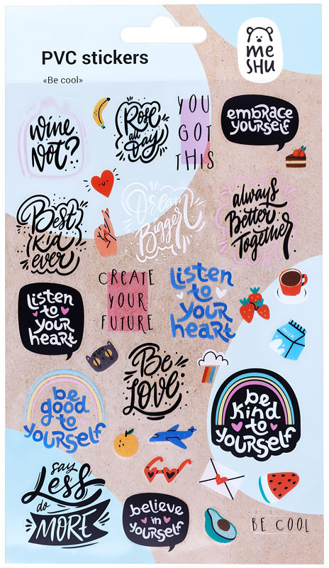 Meshu Наклейки «Be cool»В данный момент этот товар отсутствует в продаже. Возможно, у нас найдется аналогичный или похожий товар здесь. Наклейки MESHU из ПВХ идеально подходят для оформления записей, открыток, поделок, а также украшения канцтоваров, телефонов, ноутбуков, предметов интерьера. Набор состоит из 1 листа. Яркие современные дизайны сделают творческий процесс увлекательным и подарят отличное настроение. |