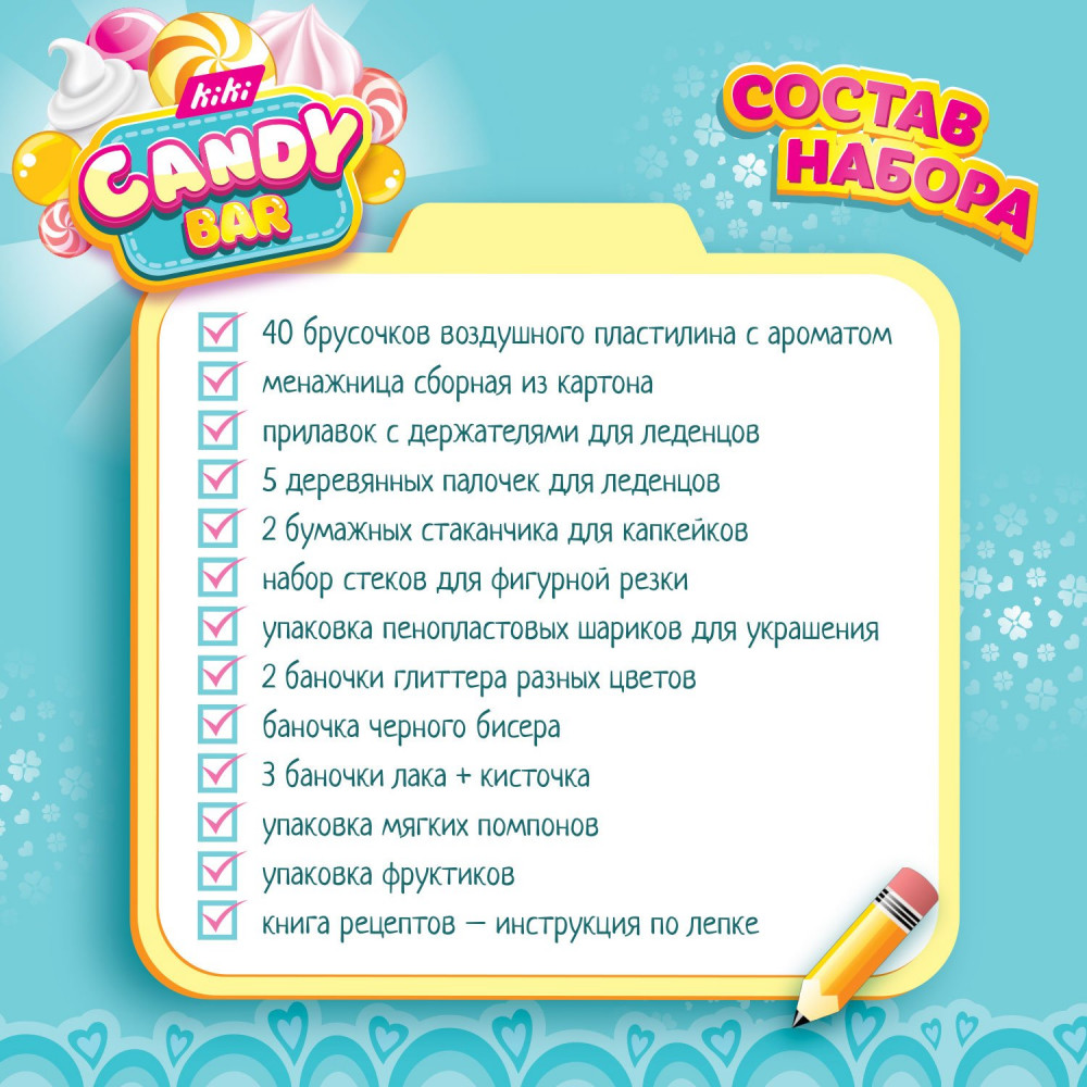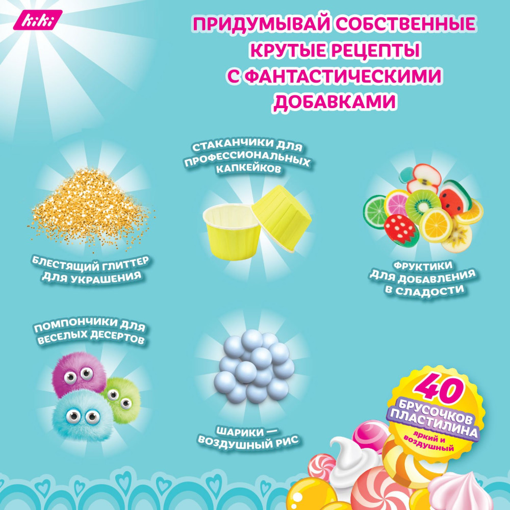 KiKi Набор для лепки «Candy Bar»В данный момент этот товар отсутствует в продаже. Возможно, у нас найдется аналогичный или похожий товар здесь. Представляем уникальный набор по лепке из воздушного пластилина «Мастерская десертов Candy bar»! В таком наборе по лепке есть все, чтобы ребенок смог создать свой магазин сладких товаров, в который будет с удовольствием играть. «Мастерская десертов Candy bar» — это отличный подарок для ребенка. Магазин сладостей станет любимой игрой не только для детей, но и для родителей. |