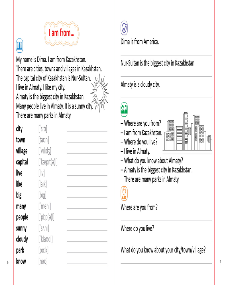 Бұл құрал «English for beginners» топтамасының 3-ші сатысы болып табылады және кіші жастағы оқушылардың ағылшын тіліндегі сөйлеу дағдыларын қалыптастыруға арналған. Құралдың негізгі мақсаты оқу дағдысын дамыту мен мәтіндерді сауатты аудару; сөздік қорды байыту; сөйлеу әрекеттерін жетілдіру болып табылады. Әрбір беттің ашылған жағында бастауыш мектепте оқып-үйренетін лексикалық тақырып берілген және тақырыпқа сәйкес сөздер берілген. Барлық сөздер мен сөз тіркестерінің транскрипциясы бар. Оқушылар көрсетілген жерге сөздік пен интернет көздерін пайдалана отырып тапқан сөздің аудармасын жазуы керек. Мұндай іздеу жұмыстары оқушыларға жаңа сөздерді есте сақтауына көмектеседі. Бұдан басқа, құралда сөйлеу әрекеттерін дамытуға арналған диалогтар мен бекітуге арналған жазба жұмыстары да берілген. Әрбір сабақтың соңында оқушы өзі туралы сұрақтарға жауап беретін тапсырмалар көрсетілген. Егер бір қиындықтар туындаса (мысалы, үйінде үй жануары жоқ болса) онда жауап еркін түрде жазылады. Бұл тапсырмалардың мақсаты — ағылшын тілінде сөйлемдерді дұрыс құрастыру қабілетін дамыту.
