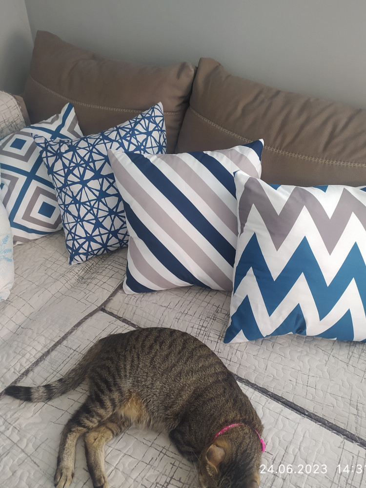 С диваном в комплекте шли 4 подушки , но такое безобразие внутри, я их сразу же выкинула, а наволочки ждали своего часа и вот встретила этот комплект, размер совпадает, и теперь такие славные подушечки на диване.
