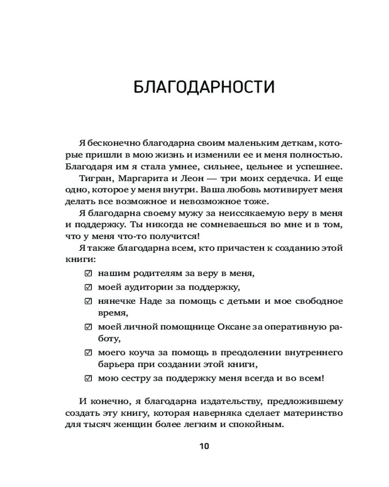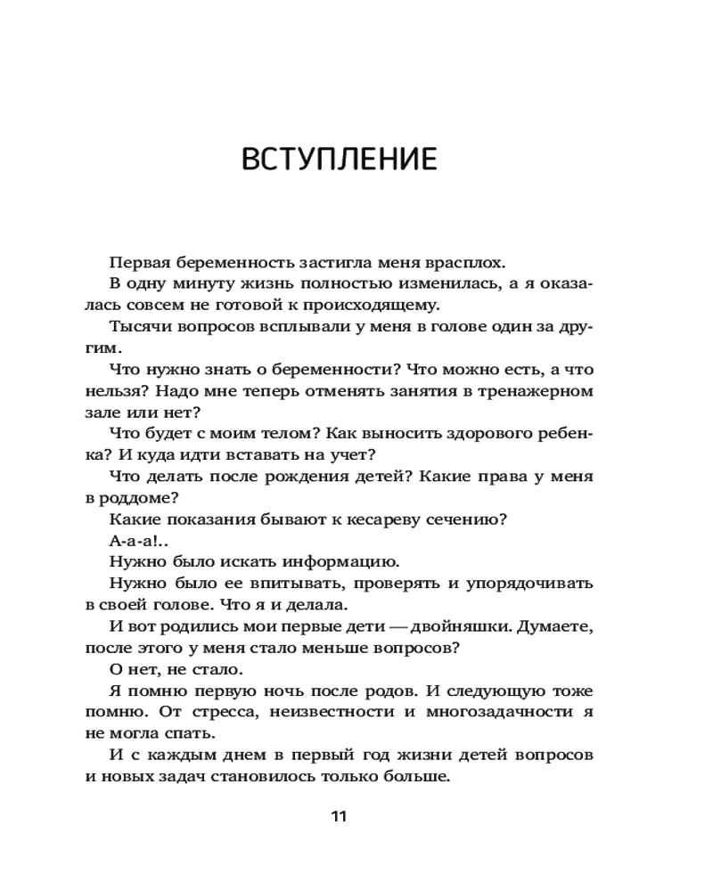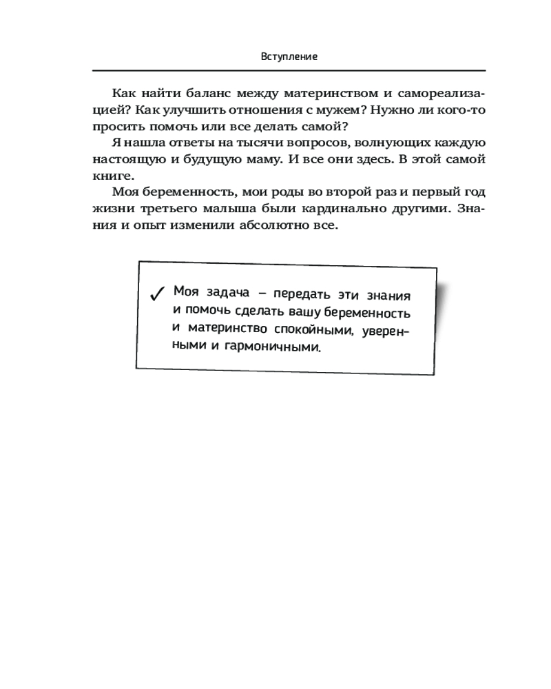 Благодаря этой книге женщина сможет найти баланс между материнством и самореализацией, получит ответы на самые важные вопросы: как выносить здорового ребенка, как выбрать врача и роддом, как улучшить отношения с мужем, как получить помощь от государства и место в детском саду, как справляться с детской ревностью и переживать детские кризисы.