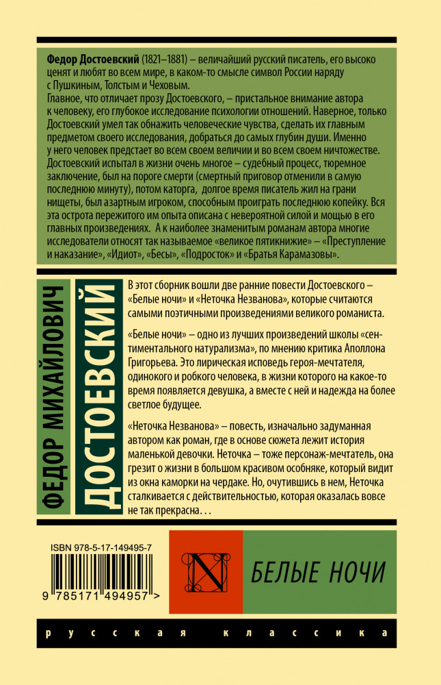 💳 Оплатить за товар можно при получении 🇰🇿 Есть бесплатная доставка по Казахстану от 1 дня 🎁 Копите бонусы с каждой покупки Серия: Эксклюзивная классика (Лучшее) В этот сборник вошли две ранние повести Достоевского — «Белые ночи» и «Неточка Незванова», которые считаются самыми поэтичными произведениями великого романиста. |