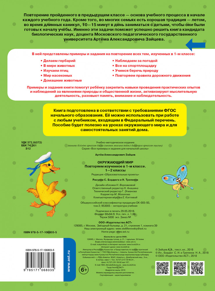 💳 Оплатить за товар можно при получении 🇰🇿 Есть бесплатная доставка по Казахстану от 1 дня 🎁 Копите бонусы с каждой покупки Серия: Все примеры и задания для начальной школы Повторение пройденного в предыдущем классе — основа учебного процесса в начале каждого учебного года. Кроме того, во многих семьях есть хорошая традиция — летом, во время длинных каникул, 10-15 минут в день заниматься с детьми, чтобы они были готовы к началу учёбы. Именно эти задачи поможет успешно решить книга кандидата биологических наук, доцент Московского Педагогического Государственного Университета Артёма Александровича Зайцева. |